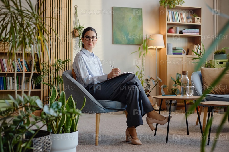 Портрет молодой взрослой белокожей женщины, проводящей психологическое консультирование