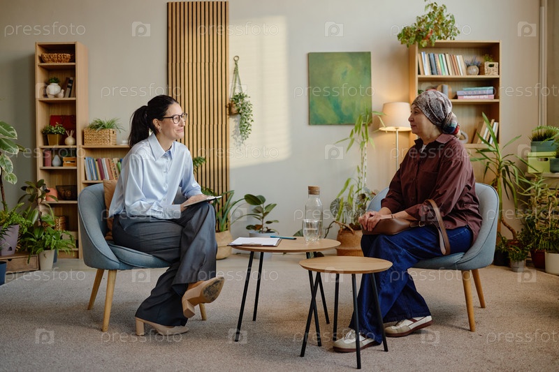 Кавказская женщина среднего возраста консультируется с психологом во время сеанса терапии