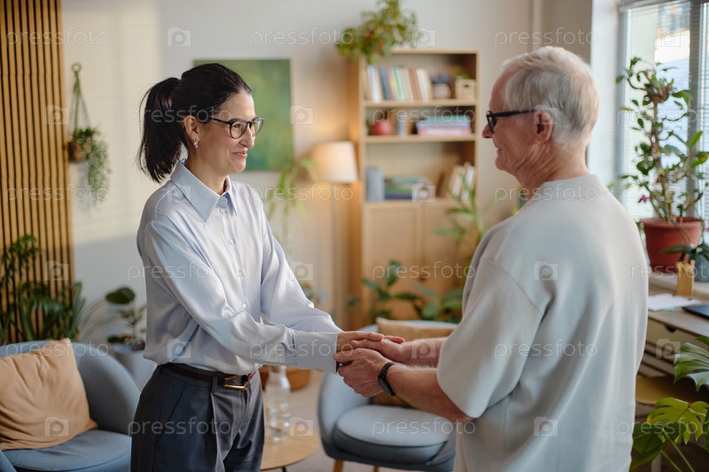 Белая женщина средних лет поддерживает старшего белого мужчину во время консультации