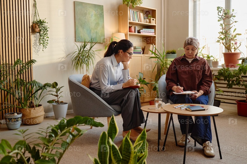 Кавказская женщина средних лет, консультирующаяся с женщиной среднего возраста во время сеанса терапии