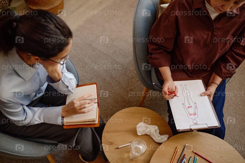 Кавказская женщина средних лет обсуждает рисунок человеческого тела с молодой взрослой женщиной