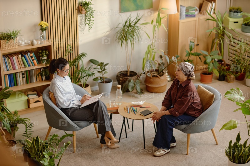 Женщина среднего возраста посещает терапевтический сеанс с психотерапевтом для молодых взрослых