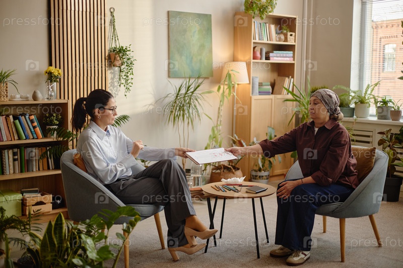 Женщина среднего возраста посещает терапевтический сеанс с психологом-женщиной