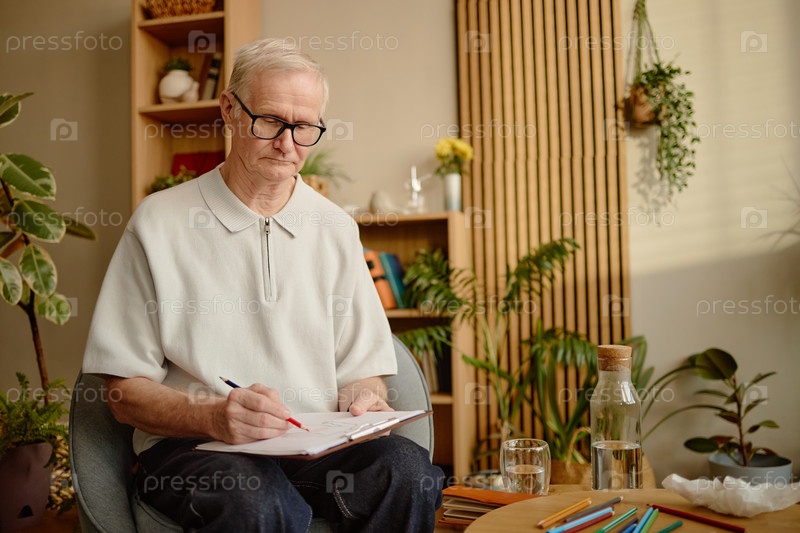 Старший кавказский мужчина рисует эскизы во время сеанса психологической терапии