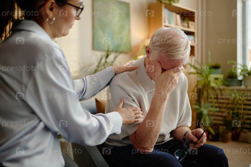 Белая женщина средних лет утешает старшего белого мужчину, который плачет в помещении