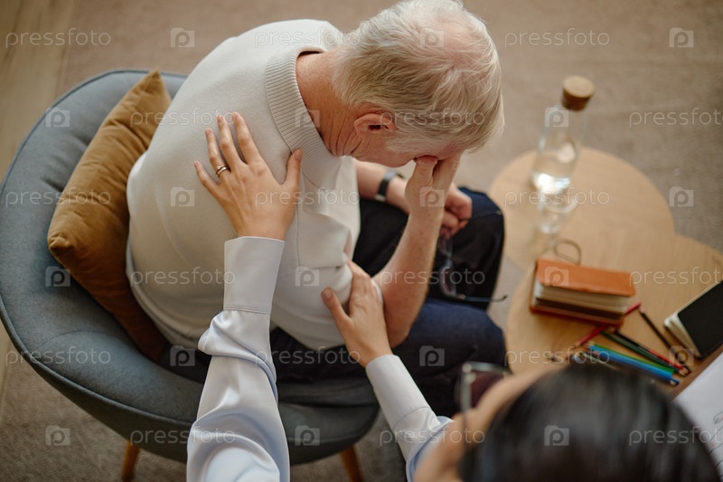 Старший белый мужчина сидит с головой в руке, получая утешительную поддержку