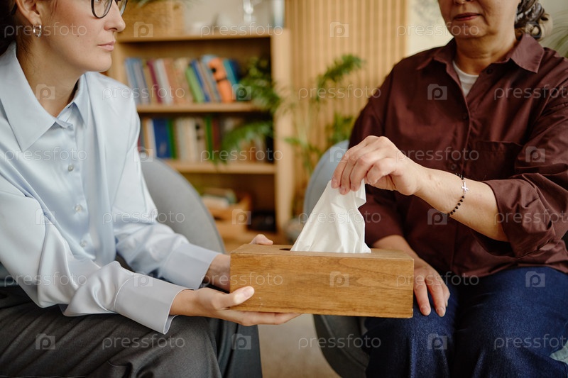 Женщина среднего возраста получает ткани от психолога во время терапии