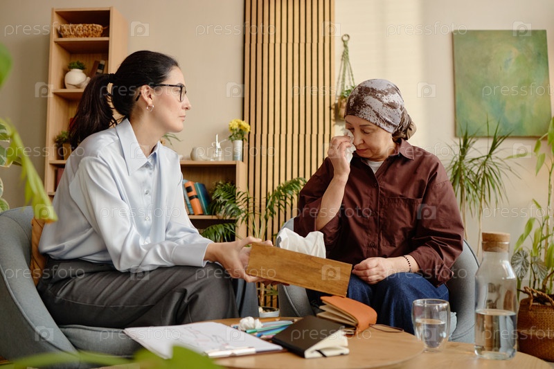 Кавказский терапевт среднего возраста утешает старшую белую женщину, которая плачет