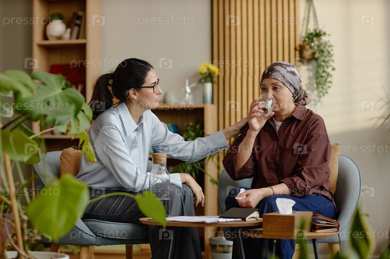 Кавказская женщина среднего возраста утешает пожилую женщину во время консультации