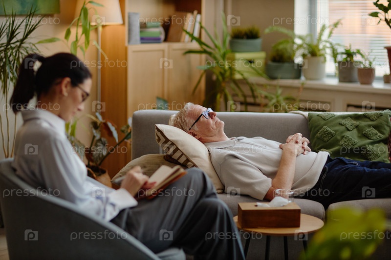 Старший белый мужчина отдыхает на диване во время психологической консультации