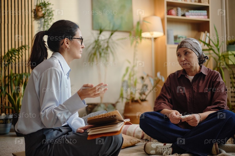 Кавказская женщина среднего возраста привлекает старшую женщину к поддерживающему разговору в помещении