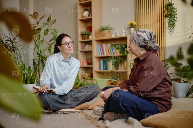 Молодая кавказская женщина психолог консультирует старшую женщину во время сеанса терапии