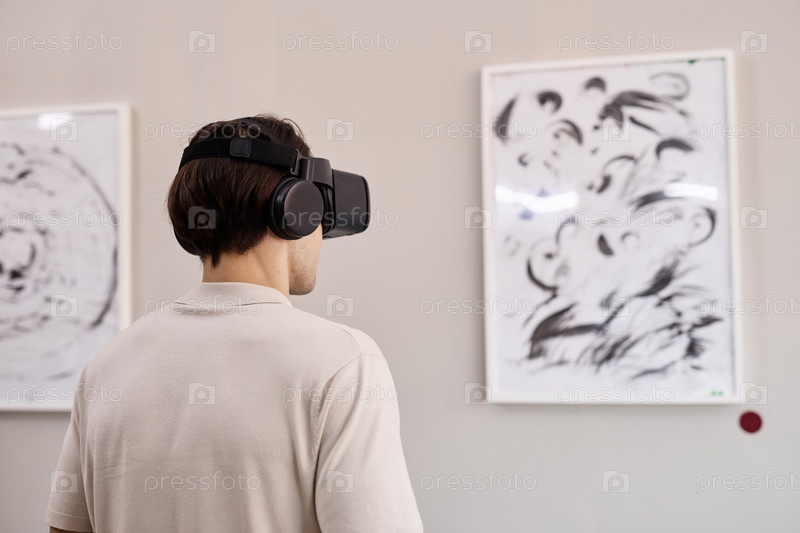 Молодой взрослый белый мужчина испытывает виртуальную реальность просматривая абстрактное искусство