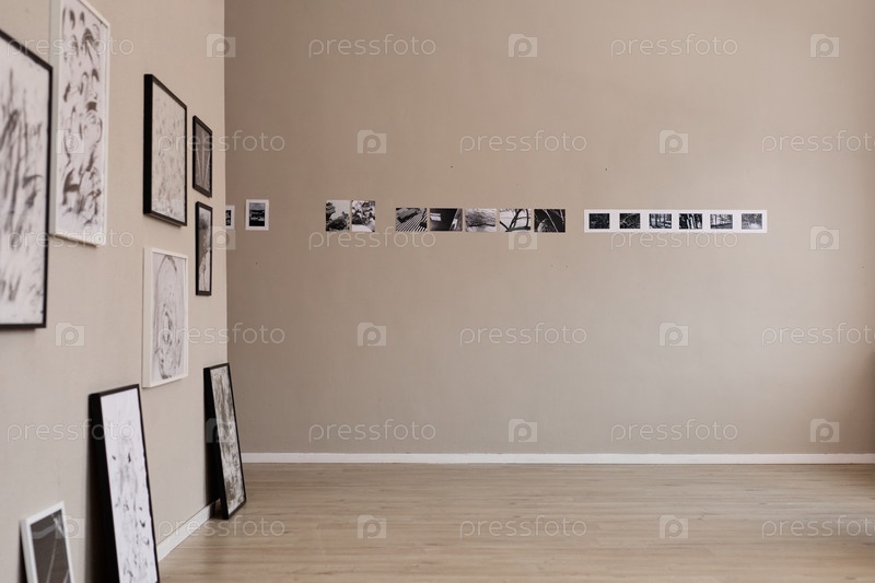 Пустая художественная галерея демонстрирует черно-белые фотографии на бежевой стене