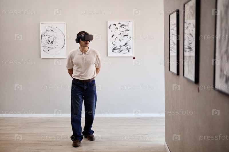 Кавказский мужчина средних лет, испытывающий виртуальную реальность в художественной галерее