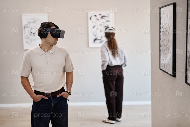Молодой белый мужчина, носящий гарнитуру виртуальной реальности, наблюдает за художественной выставкой