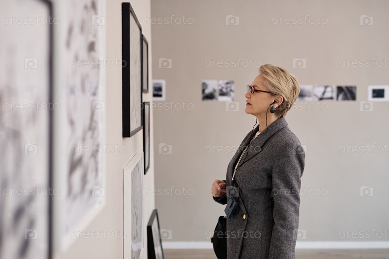 Старшая кавказская женщина, наблюдающая за произведениями искусства на выставке галереи современного искусства
