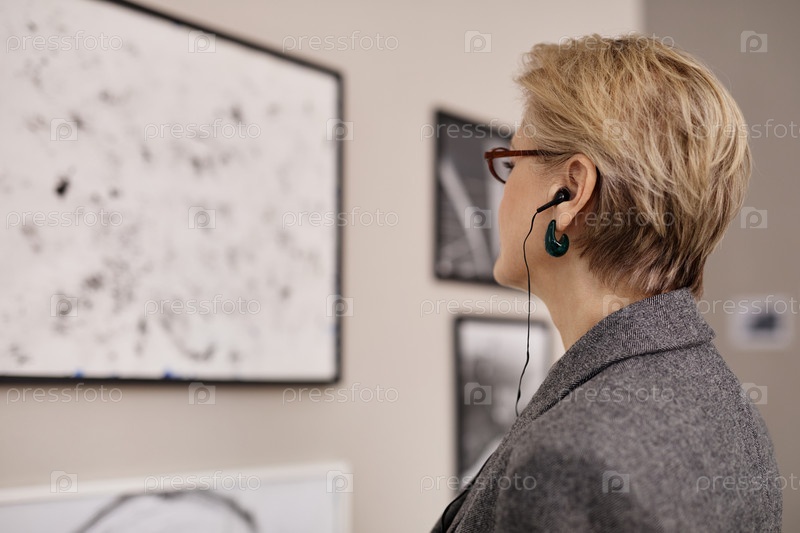 Кавказская женщина средних лет наблюдает за произведениями искусства, слушая аудиогид