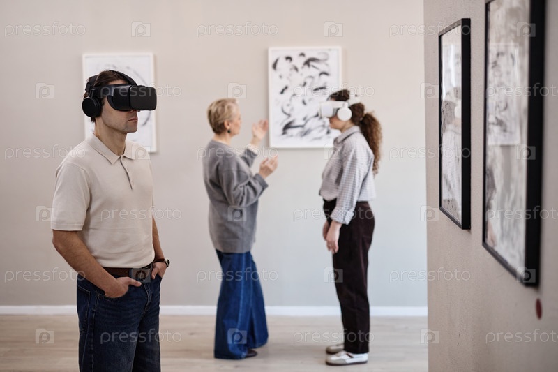 Молодой мужчина и женщина, испытывающие виртуальную реальность в художественной галерее