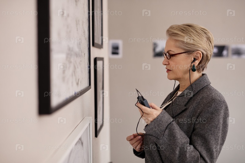 Кавказская женщина средних лет слушает аудиогид во время просмотра художественной выставки