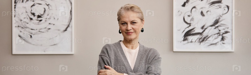 Портрет уверенной старшей белокожей женщины, стоящей с перекрещенными руками