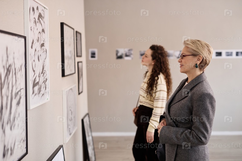 Белая женщина средних лет наблюдает за произведениями искусства с молодой взрослой белокожей женщиной