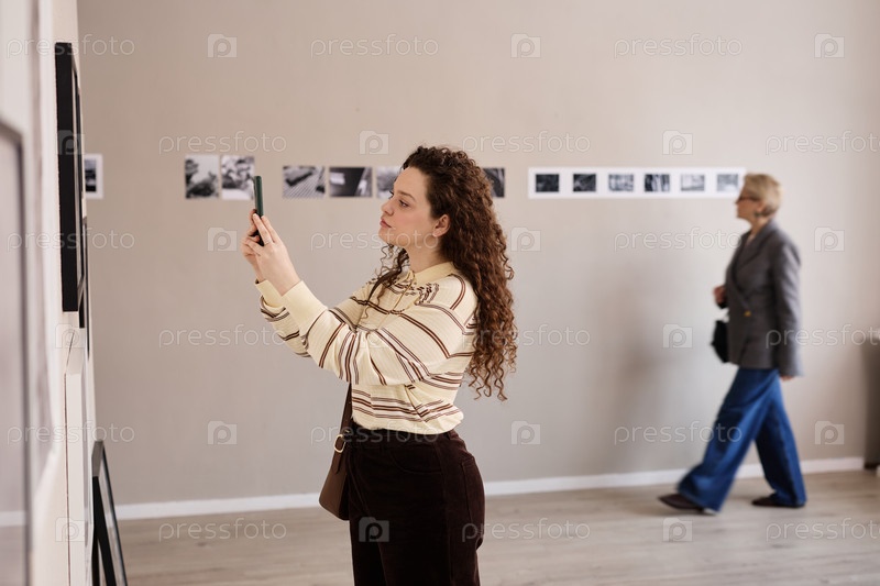 Молодая кавказская женщина фотографирует произведения искусства на выставке галереи современного искусства