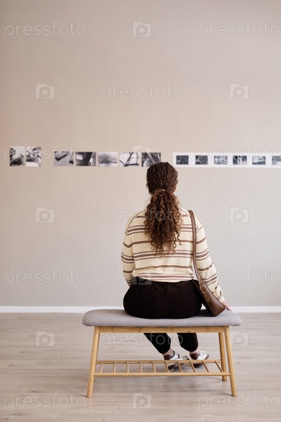 Молодая взрослая белая женщина наблюдает за фотографиями в галерее современного искусства