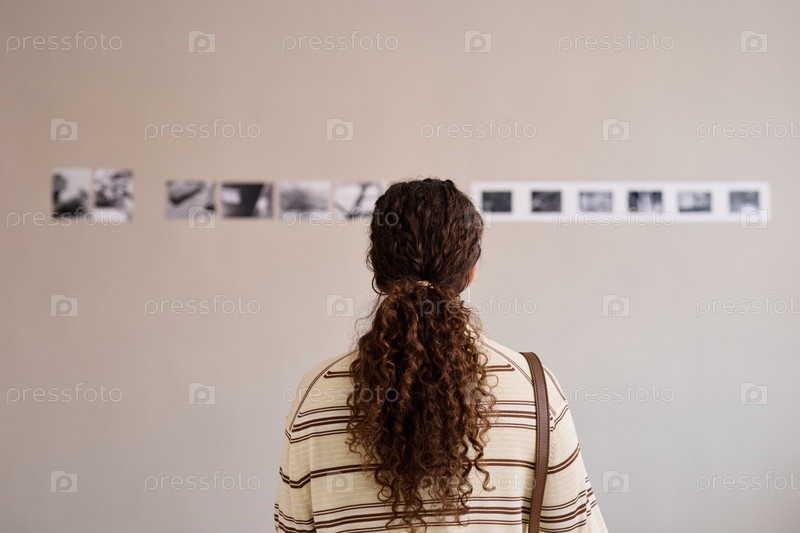 Молодая взрослая белая женщина наблюдает за фотографиями, отображаемыми на стене галереи