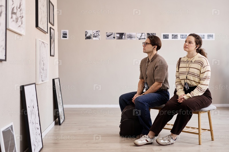 Молодой кавказский мужчина и женщина наблюдают за произведениями искусства в современной галерее