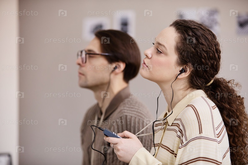 Молодая кавказская женщина и молодой мужчина слушают аудиогид во время посещения музея