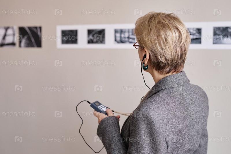 Кавказская женщина средних лет использует аудиогид во время посещения художественной выставки