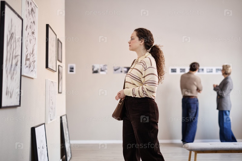 Молодая кавказская женщина наблюдает за произведениями искусства на выставке галереи современного искусства
