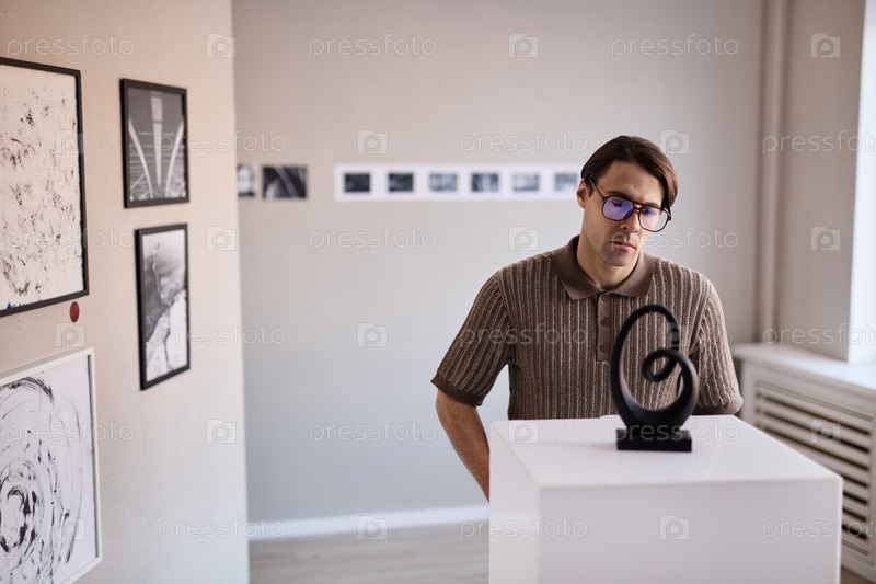 Молодой белый мужчина наблюдает абстрактную скульптуру в художественной галерее