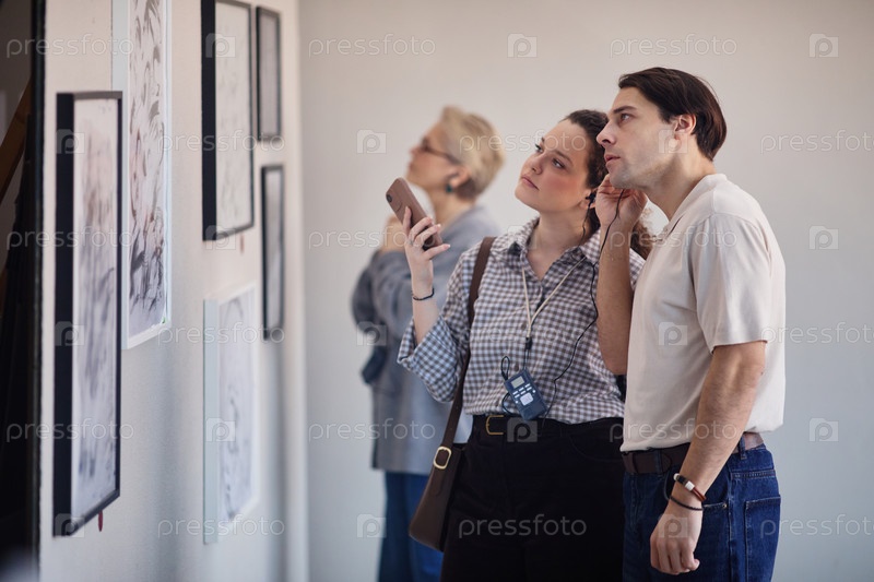 Молодая кавказская женщина и молодой мужчина наблюдают за произведениями искусства во время выставки в галерее