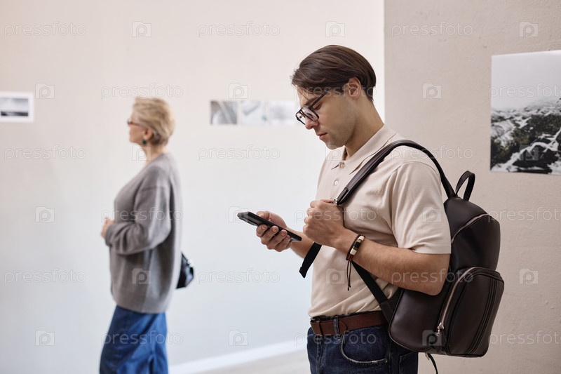 Молодой белый мужчина использует смартфон во время посещения выставки в художественной галерее