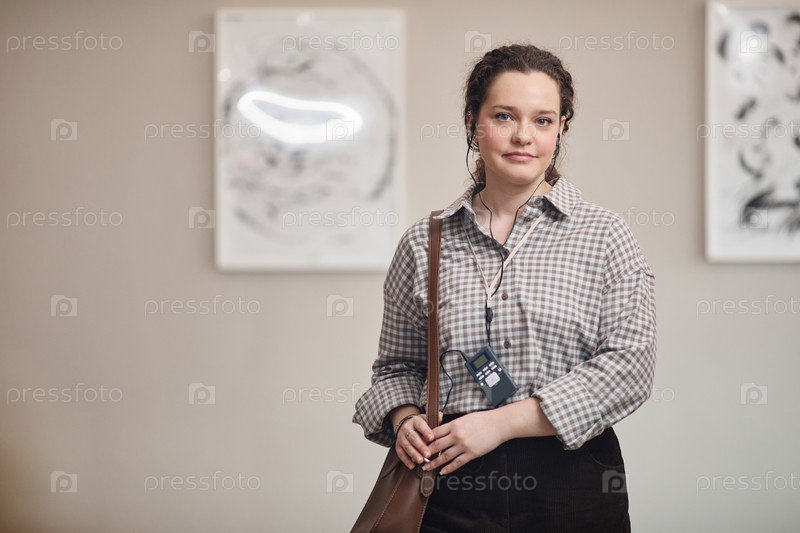 Портрет молодой взрослой белокожей женщины, одетой в аудиогид и стоящей внутри