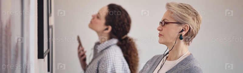 Кавказская женщина средних лет наблюдает за искусством, слушая аудиогид