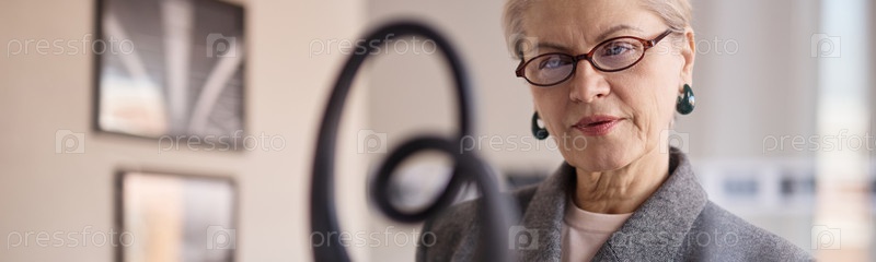 Портрет старшей белокожей женщины, наблюдающей за современной скульптурой в галерее