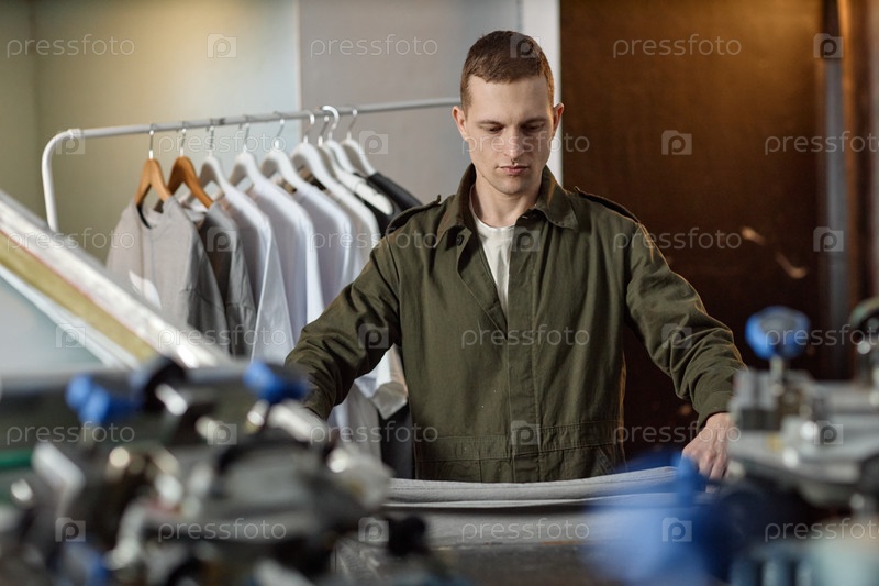 Молодой человек работает на текстильной фабрике, готовя ткань к производству