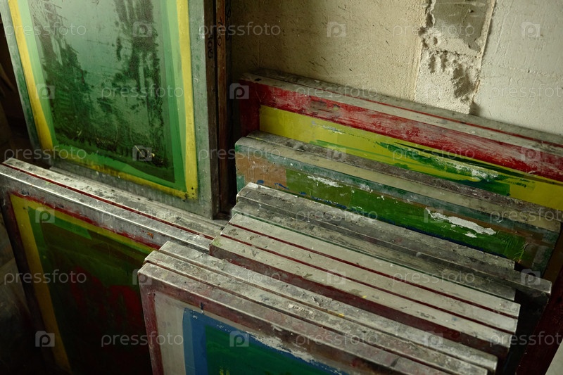 Куча используемых рамок для печати экрана, опирающихся на грязную стену мастерской