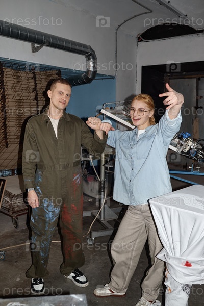 Вертикаль молодого человека и женщины, позирующих вместе в условиях промышленной мастерской