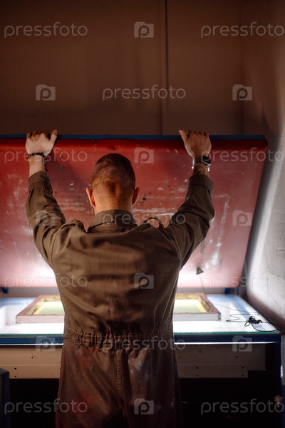 Вертикальная крышка юношеского взрослого мужчины, поднимающего экспозиционный блок во время подготовки экрана
