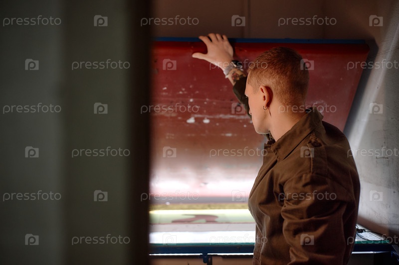 Молодой взрослый мужчина контролирует машину для воздействия ультрафиолетового излучения в мастерской по печати экрана