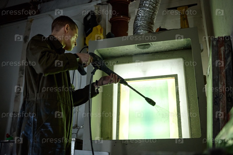 Молодой человек очищает промышленное оборудование с использованием стиральной машины под высоким давлением