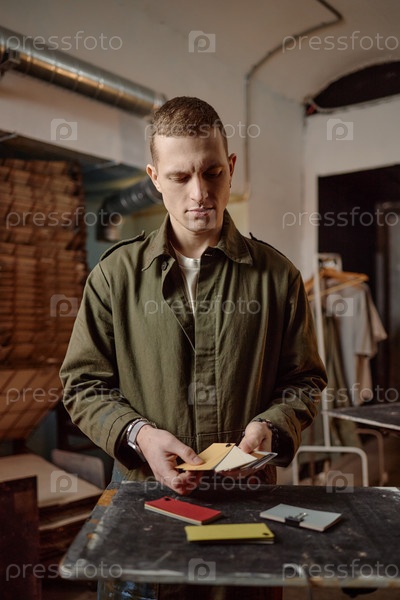 Вертикаль молодого взрослого мужчины, изучающего цветные образцы в условиях мастерской