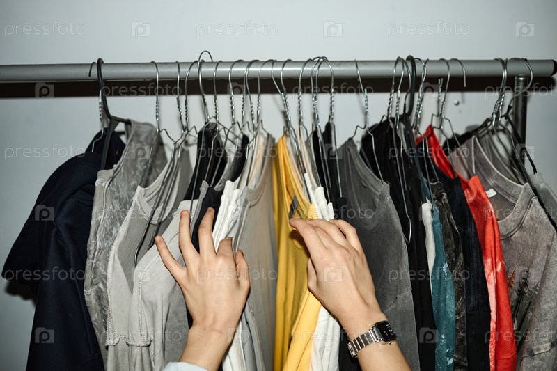 Молодая взрослая женщина просматривает висящие рубашки на стойке для одежды в помещении