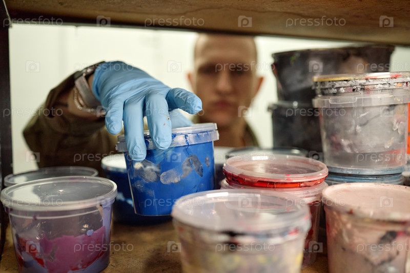 Молодой взрослый мужчина достигает контейнера для краски на полке мастерской