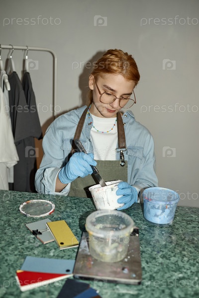 Молодая женщина смешивает образцы краски во время работы в художественной студии