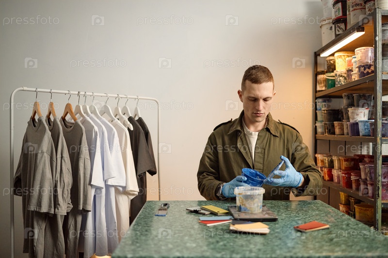 Молодой взрослый мужчина смешивает краски в рабочем пространстве студии для творческого проекта